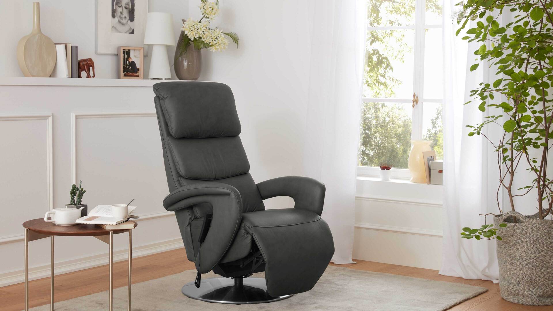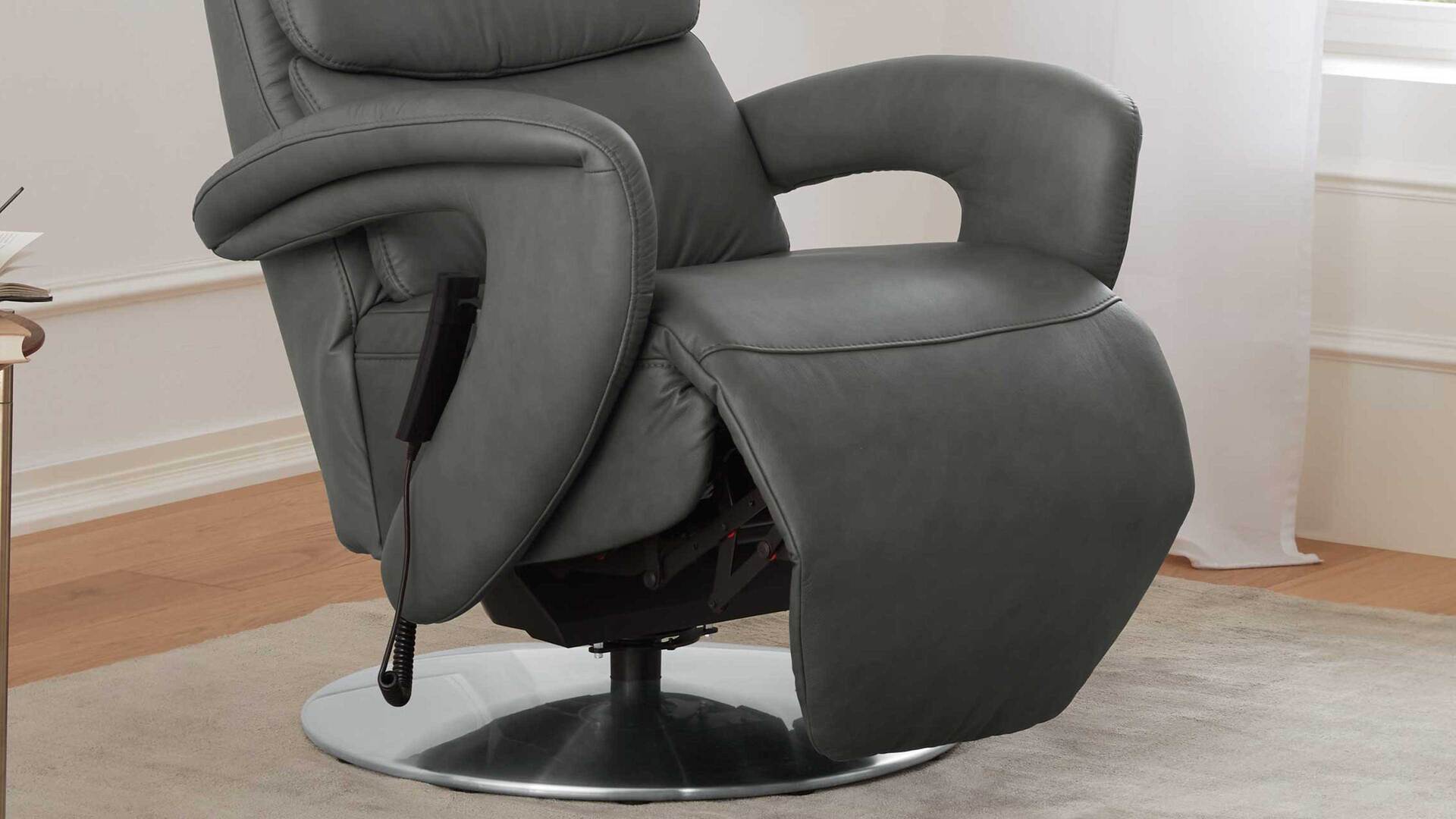 Der anthrazitfarben pigmentierte Bezug aus besonders pflegefreundlichem und leicht zu reinigendem Leder und der edelstahlfarbene Metall-Drehteller verleihen dem hochwertigen Relaxsessel B aus dem Comfortmaster Programm CM-HU1060 eine moderne und elegante Ausstrahlung.
