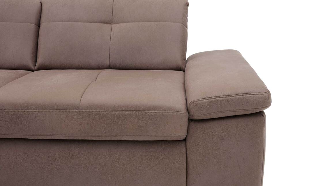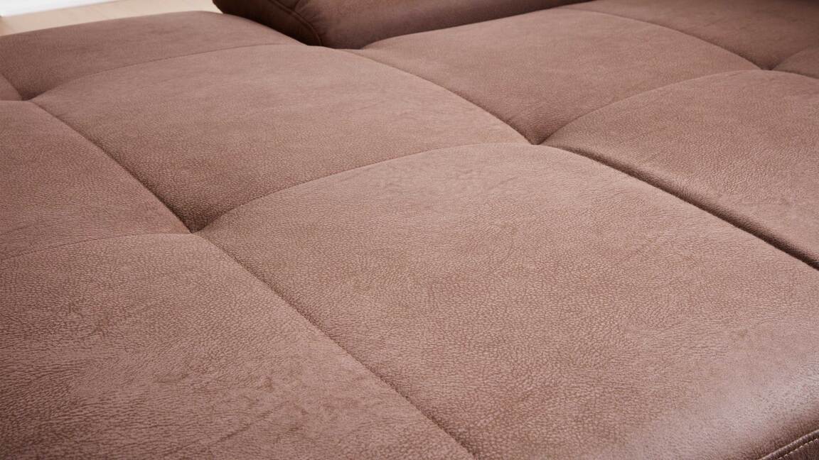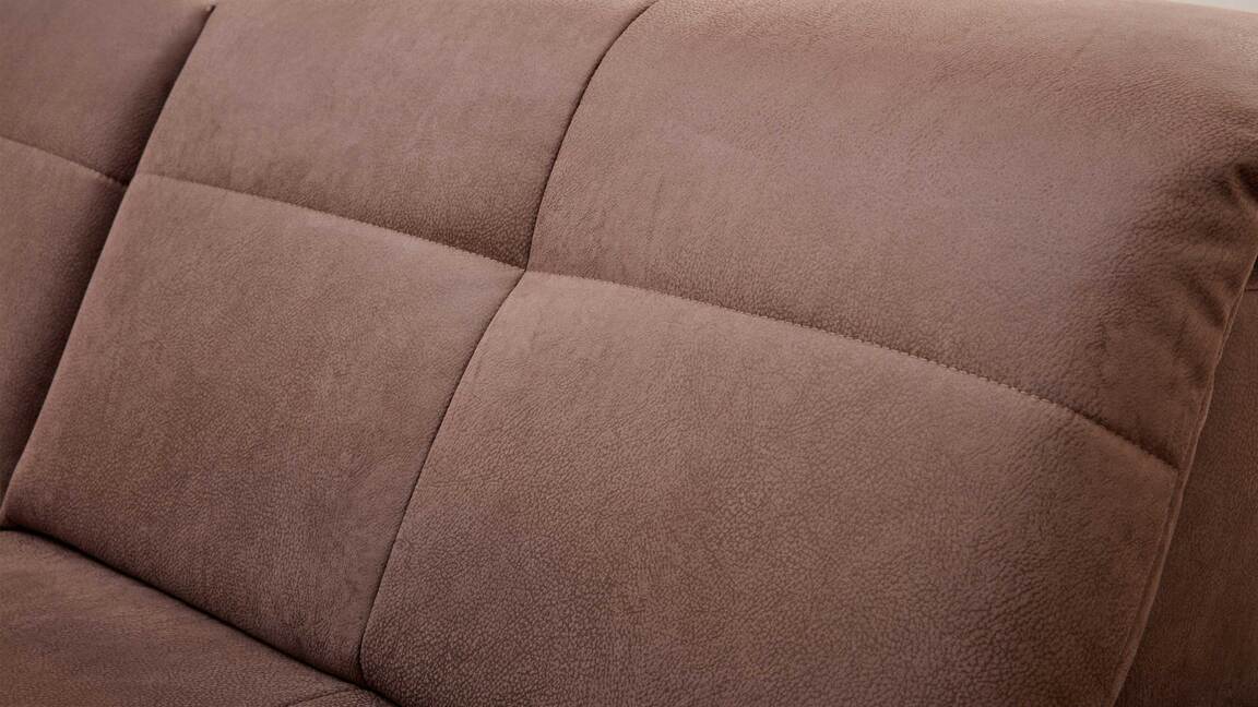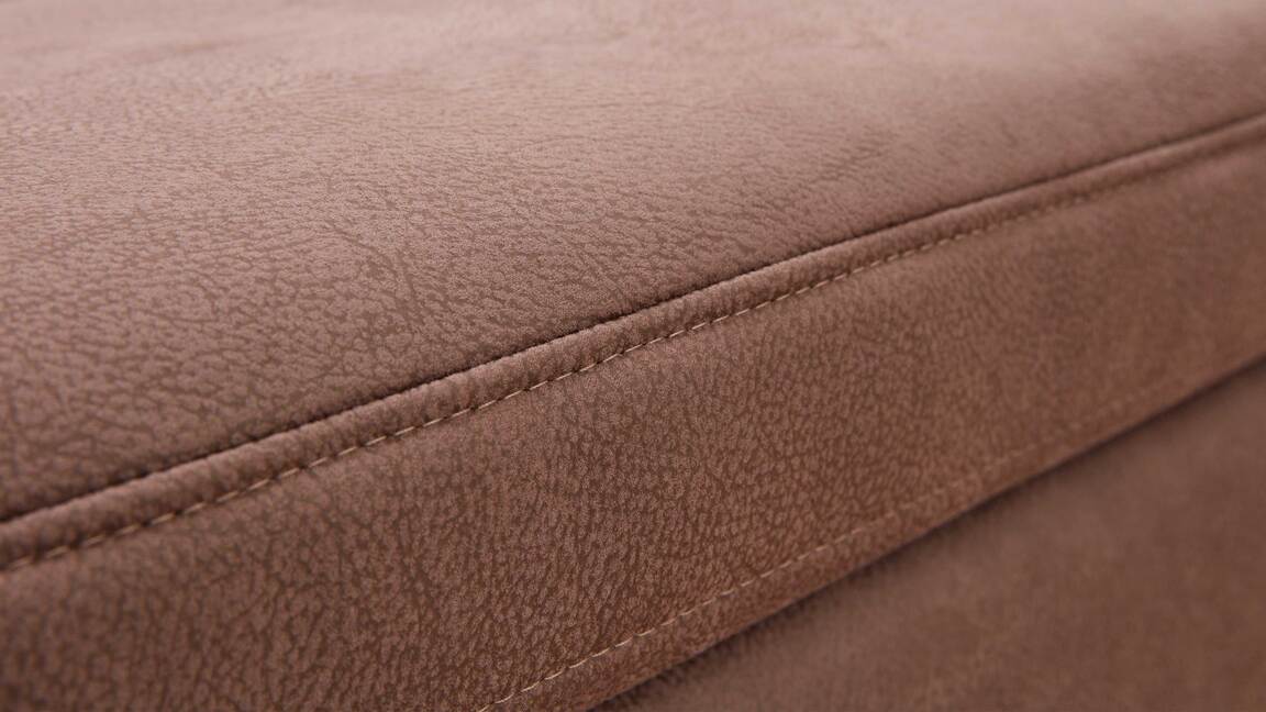 Es kombiniert einen nougatfarbenen Mikrofaserbezug mit Eiche biancofarben gebeizten Holzfüßen. Für erstklassigen Komfort sorgen der Sitz mit einer hochwertigen Federkernpolsterung, die auf einer optimal stützenden Wellenunterfederung gelagert ist, sowie der mit weichem Kaltschaum gepolsterte Rücken.