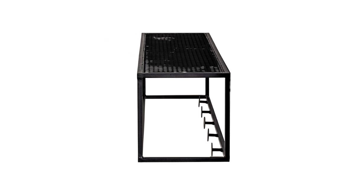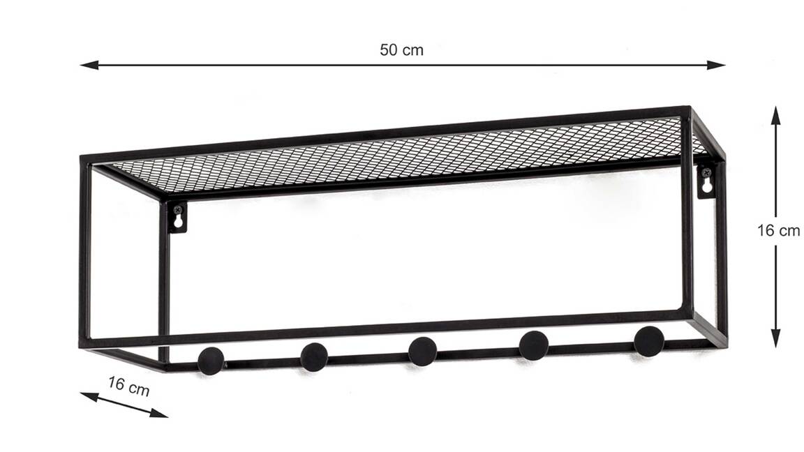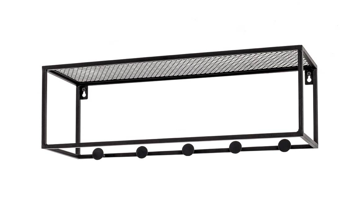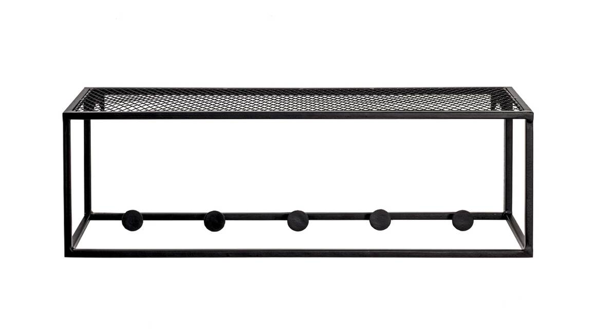 Diese hochwertige Wandgarderobe repräsentiert die Eleganz schlichter Modernität. Aus einem klassisch mattschwarz lackierten Metallgeflecht und Vierkantrohr-Metallrahmen gefertigt, erscheint sie puristisch und ist dazu enorm robust und langlebig. Ihre Maße betragen ca. 50 x 16 x 16 cm (LxHxT).