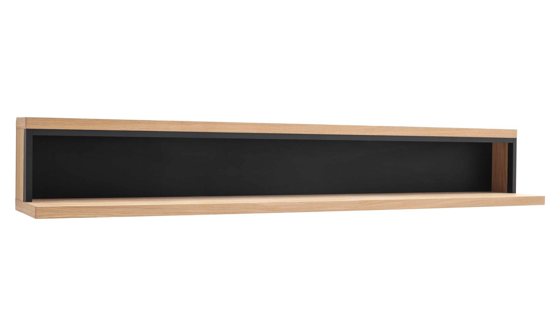 Die vierteilige Wohnwandkombination hebt sich durch sichtbare anthrazitfarbene Rückwände ab. Die Wohnwand besteht zunächst aus einer eintürigen Vitrine mit fünf Holz- sowie zwei Glasböden. Ihre Maße sind ca. 63 x 201 x 38 cm (BxHxT). Hinzu kommt das Wandregal T50 mit anthrazitfarbener Rückwand und Maßen von ca. 153 x 23 x 25 cm (LxHxT). Weiterhin gehört das Lowboard T30 zum Set. Es verfügt über zwei Auszüge plus zwei offene Fächer. Mit seinen Maßen von ca. 183 x 51 x 51 cm (BxHxT) eignet es sich für Fernseher bis 78 Zoll. Zwei Wandregale T51 runden die Wohnkombination ab. Sie bringen jeweils drei Holzböden mit und messen je ca. 33 x 103 x 25 cm (BxHxT).