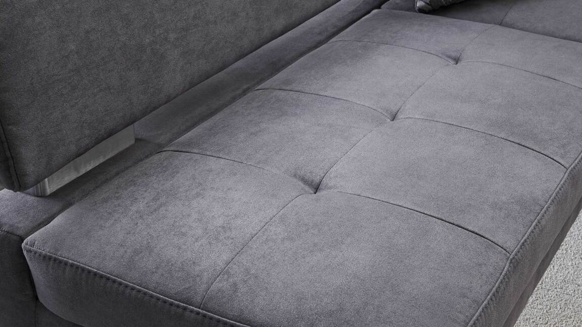 Auch optisch macht die Polster-Eckbank einiges her. Als stabilisierende Basis fungiert ein klassisch-edelstahlfarbenes Metallkufengestell. Es harmoniert vorzüglich mit dem soften Mikrofaserbezug im modernen Farbton Anthrazit. Perfekt abgerundet wird die Eckbank Genesis durch die Distanzhalter, die wiederum im Edelstahlton gehalten sind.