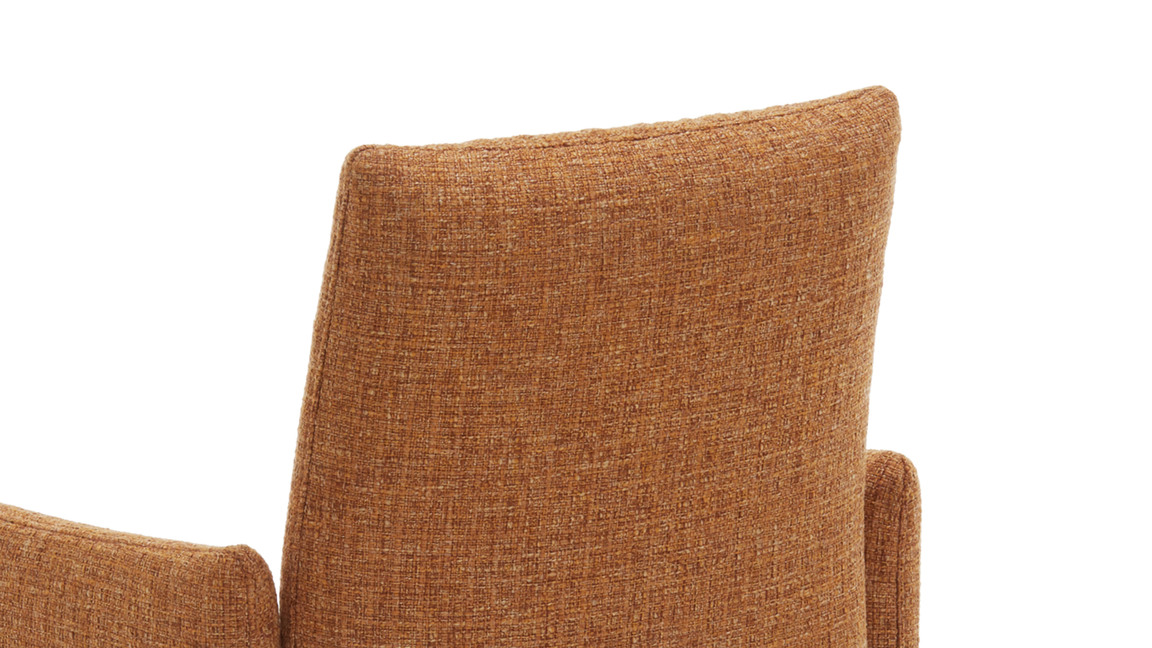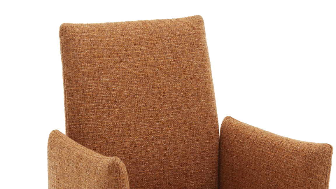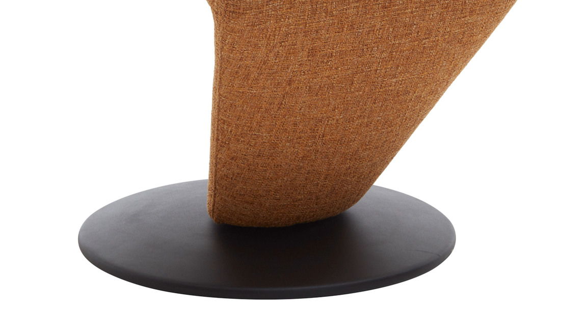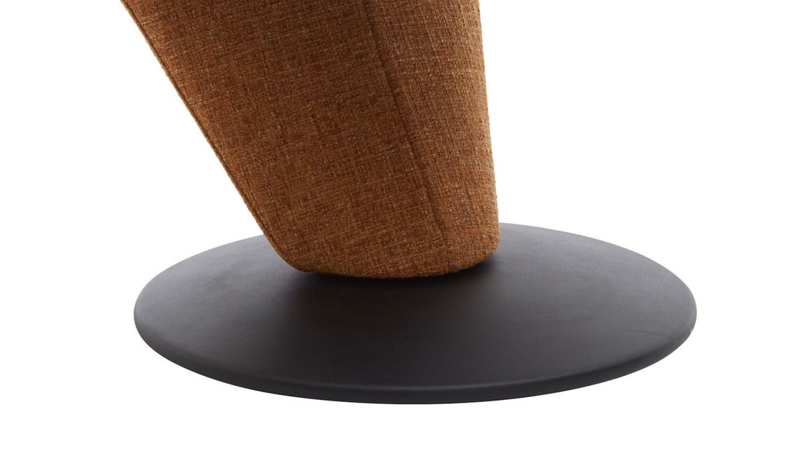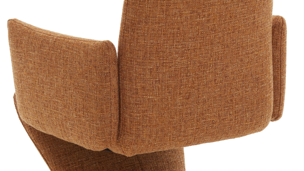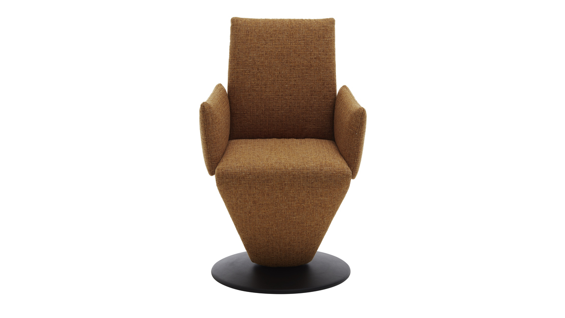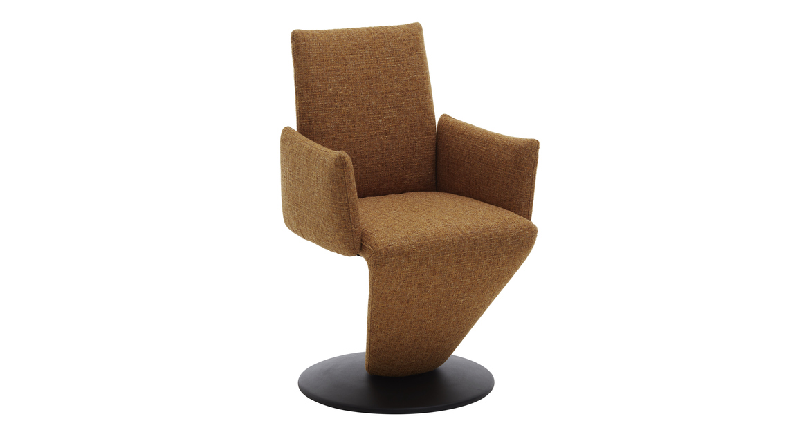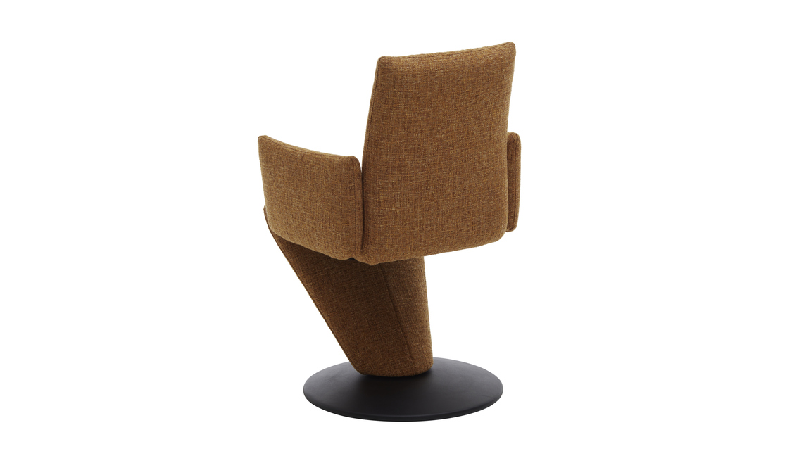 Er setzt sich aus einem schwarz pulverbeschichteten Metall-Tellerfuß mit Struktur und einem curcumafarbenen Webstoffbezug zusammen. Dank der perfekt aufeinander abgestimmten Materialien und Farben erscheint der Polsterstuhl absolut harmonisch und modern. Des Weiteren sorgen die geradlinige Formensprache, der hinten ebenfalls stoffbezogene Rücken und die schicken Zierkappnähte für besonders edles Flair.