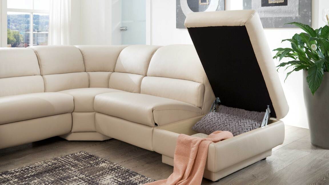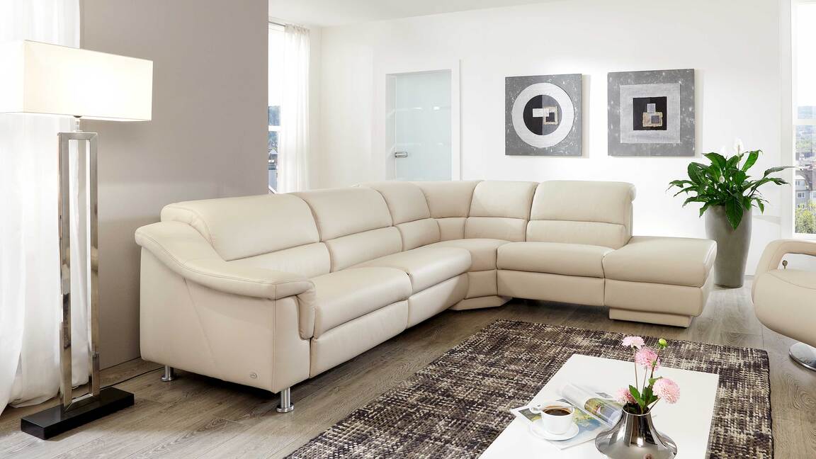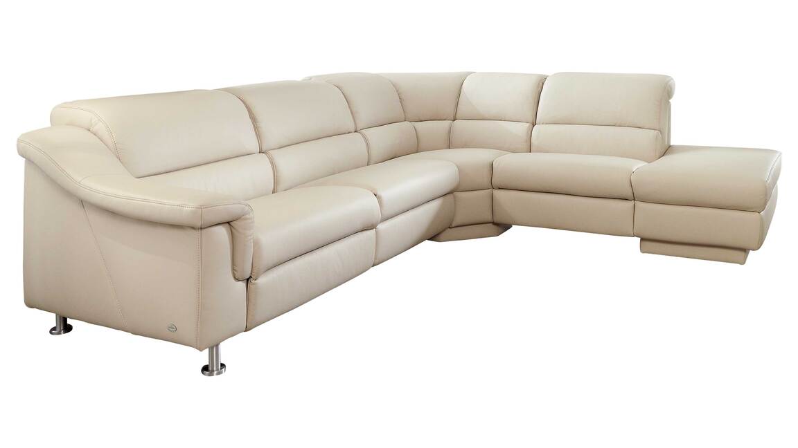 Die bequeme Sofalandschaft besteht aus dem 2,5-Sitzer 65 H SL mit Armlehne links, der Trapezecke 89X und dem Element 72 X SR mit offenem Abschlussteil rechts und aufklappbarem Hocker. Die Polsterecke hat eine Sitzhöhe von ca. 44 cm und eine Sitztiefe von ca. 55 cm. Die Federkernpolsterung ist ebenso inklusive wie der aufklappbare Hocker und die Kopfteilverstellung. Alle Rückenlehnen sind mit komfortablem Formasoft Kaltschaum gepolstert. Darüber hinaus sind alle Rückseiten im gleichen Leder bezogen - so lässt sich die Garnitur frei in den Raum stellen.