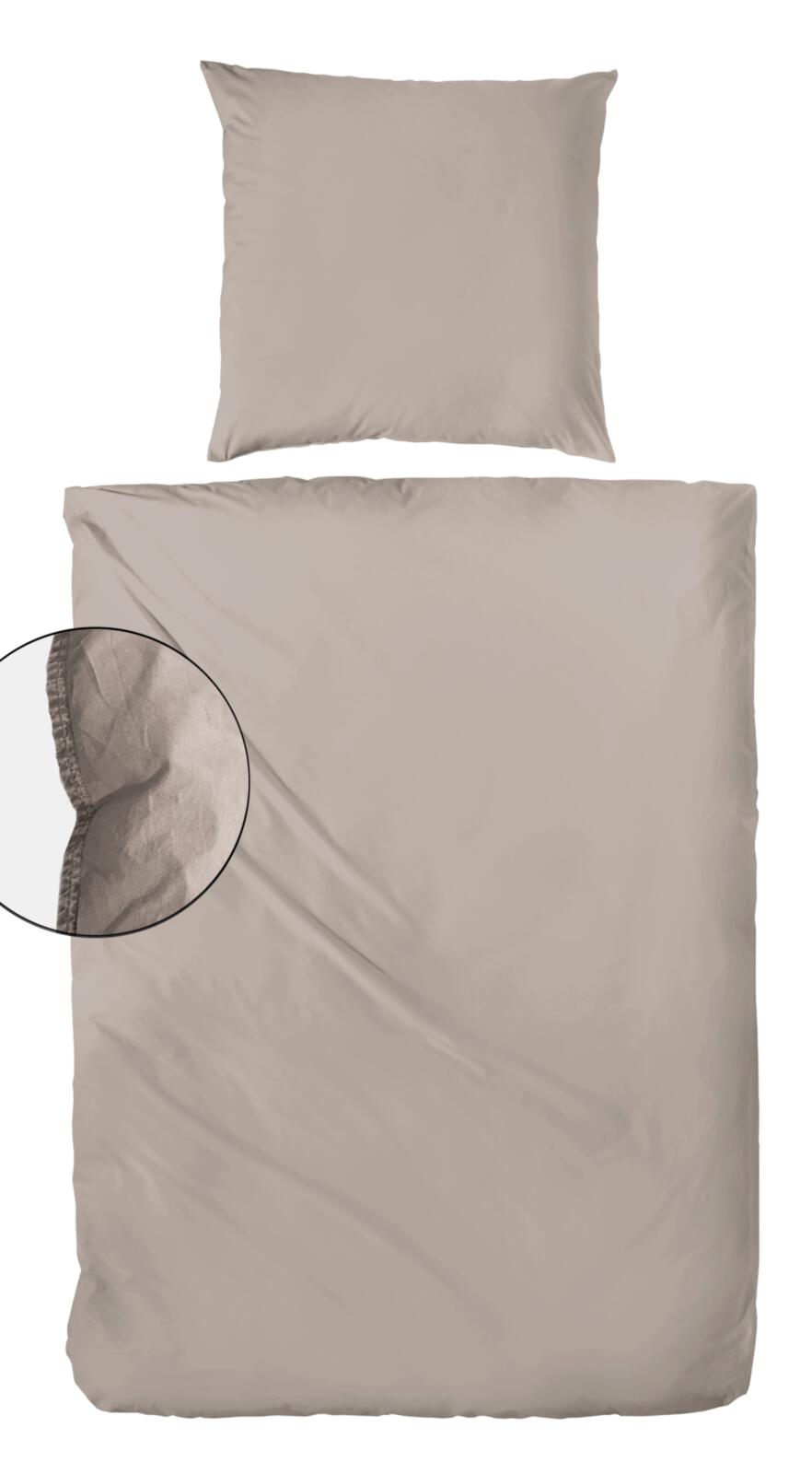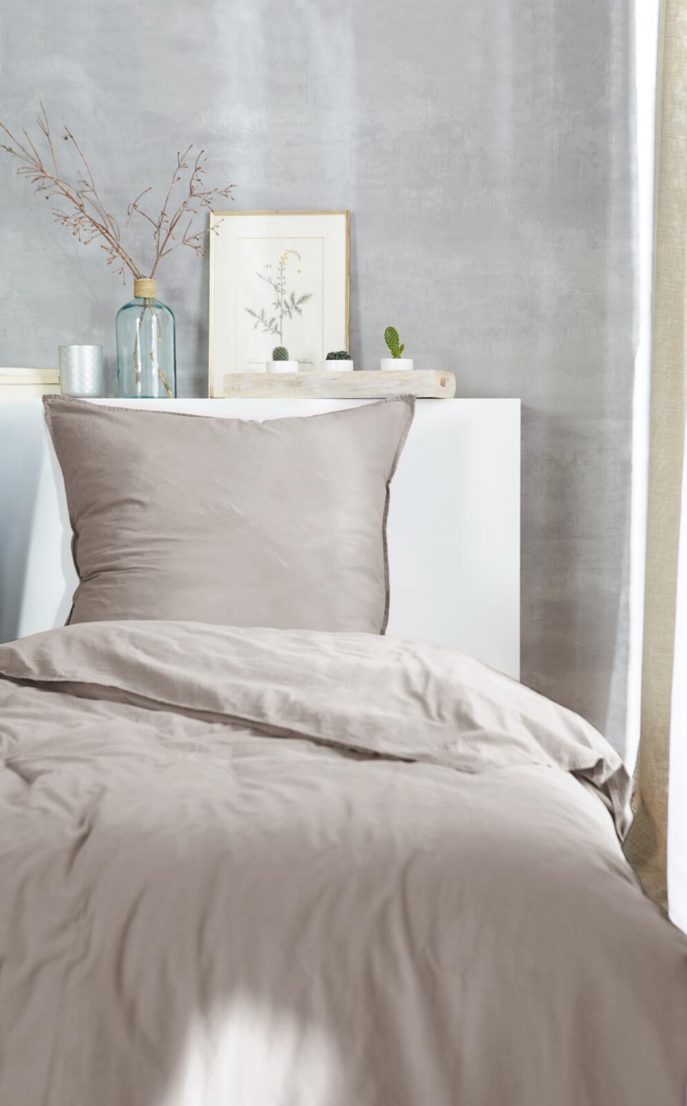 Diese Bettwäsche zeigt sich in ruhiger, gedeckter Farbgebung und schlichter Ausführung. Die Oberfläche wirkt weich im Griff und angenehm anschmiegsam, mit dem für stone-washed Ware typischen, leicht lebendigen Charakter. Das Dessin ist bewusst zurückhaltend gehalten und fügt sich harmonisch in unterschiedliche Schlafräume ein.