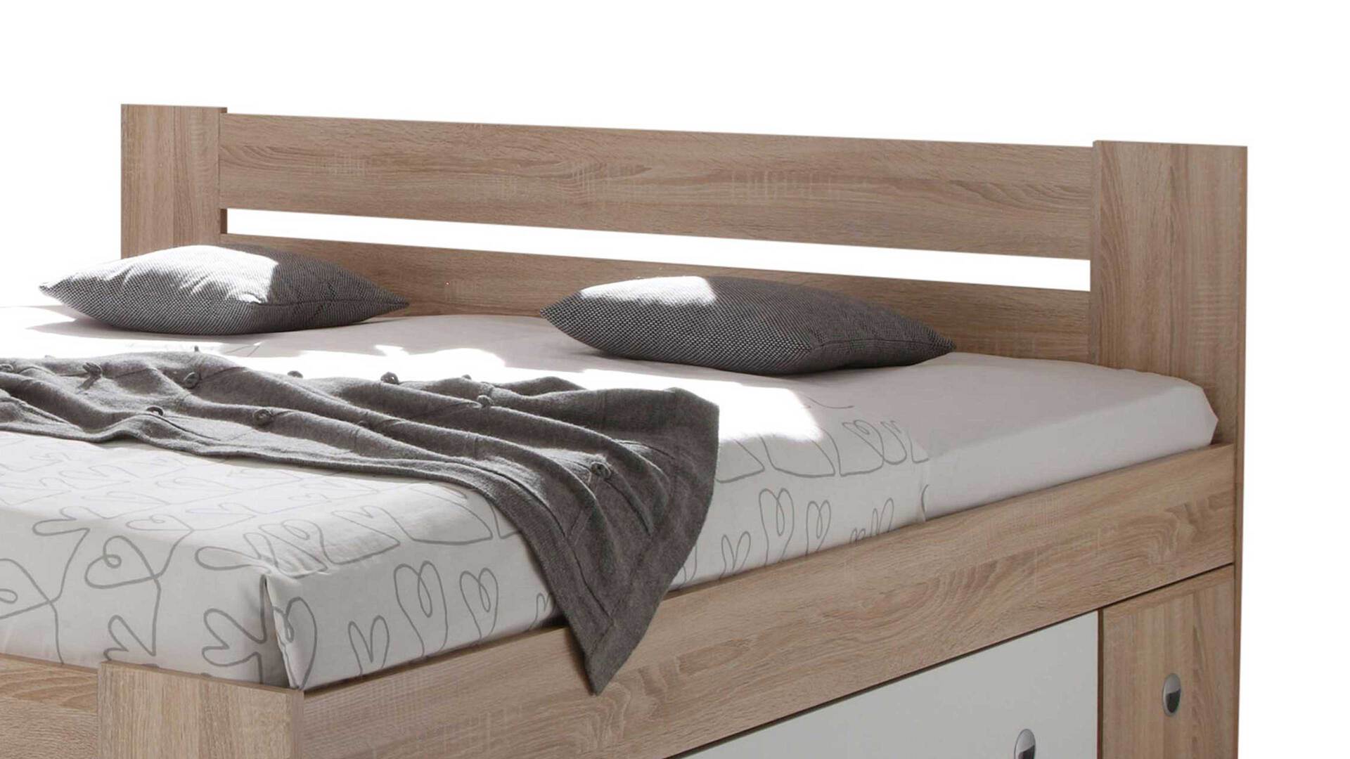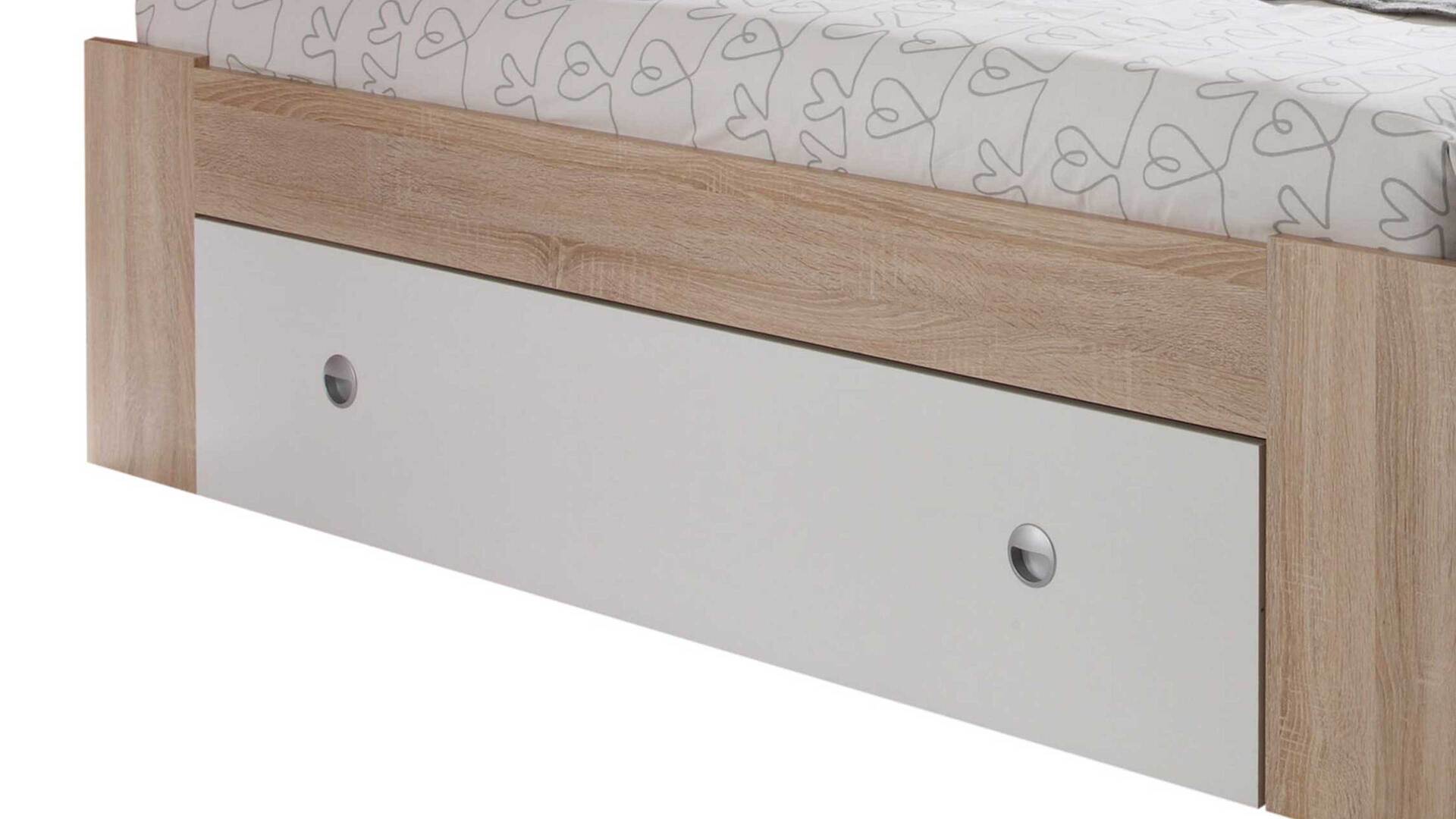 Dieses Funktionsbettgestell zeichnet sich durch eine erstklassige Verarbeitung, stilvolle Designmerkmale und eine hohe Funktionalität aus. Es präsentiert sich in Sonoma-Eiche-Nachbildung - mit gelungenen weißen Akzenten. Die hellen, perfekt aufeinander abgestimmten Farbtöne verleihen dem Doppelbettgestell eine warme Ausstrahlung mit natürlichem Charme. Dank der schlichten Nuancen und klassischen Formensprache harmoniert das Bett mit verschiedensten Einrichtungskonzepten. Puristisch-alufarbene Griffe runden das Gestell passend ab.