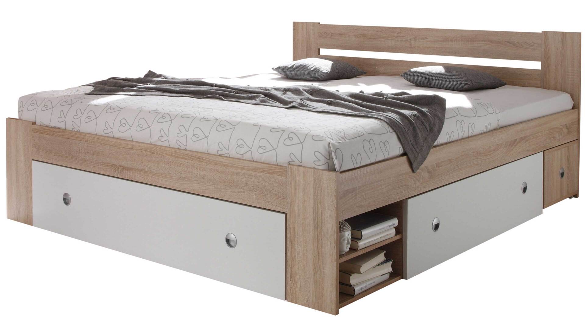 Apropos Griffe: Das Bettgestell ist mit drei Schubladen ausgestattet, in denen etwa Bettwäsche sowie Ersatz-Bettdecken und Ersatz-Kissen licht- und staubgeschützt Platz finden. Überdies beherbergt das Bett insgesamt vier offene Fächer - jeweils zwei auf der linken und rechten Bettseite. Das ist noch immer nicht alles, was dieses Bettgestell an Stauraum zu bieten hat: Es wird mit zwei Nachtkommoden geliefert, die je zwei offene Fächer mit sich bringen. Auch auf den Oberböden der Konsolen lassen sich diverse Gegenstände platzieren - beispielsweise eine Nachttischlampe und Taschentücher oder das Buch, das aktuell gelesen wird.