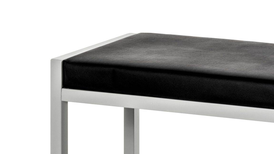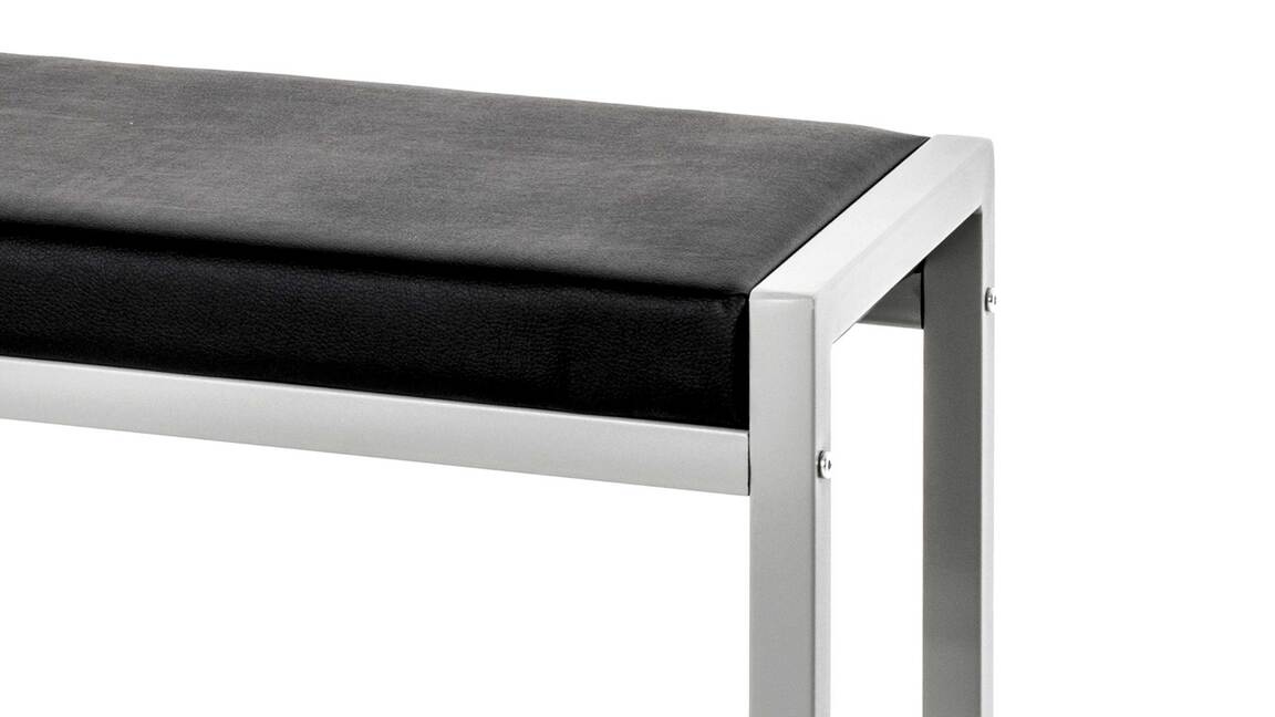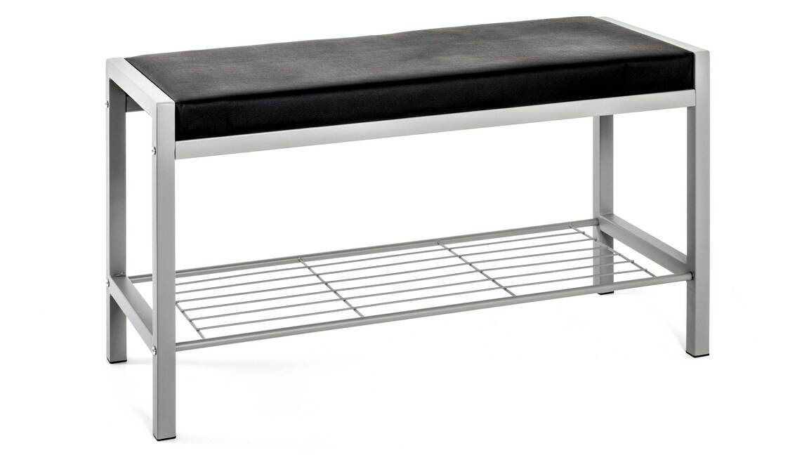 Diese moderne Garderobenbank wird garantiert zu einem Blickfang im Flur oder dem Eingangsbereich Ihres Zuhauses. Gefertigt wurde das praktische Dielenmöbel aus alufarbenem Stahlrohr sowie pflegeleichtem Stahldraht. Ein schwarzer Kunstlederbezug verleiht dem Kleinmöbel einen edlen Touch. Die multifunktionale Sitzbank begeistert nicht nur mit ihrer weich gepolsterten Sitzfläche, sondern auch mit ihren kompakten Maßen von nur ca. 80 x 48 x 32 cm (BxHxT).