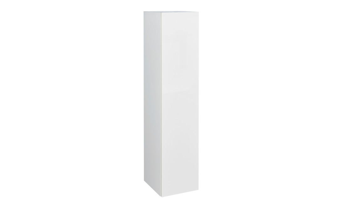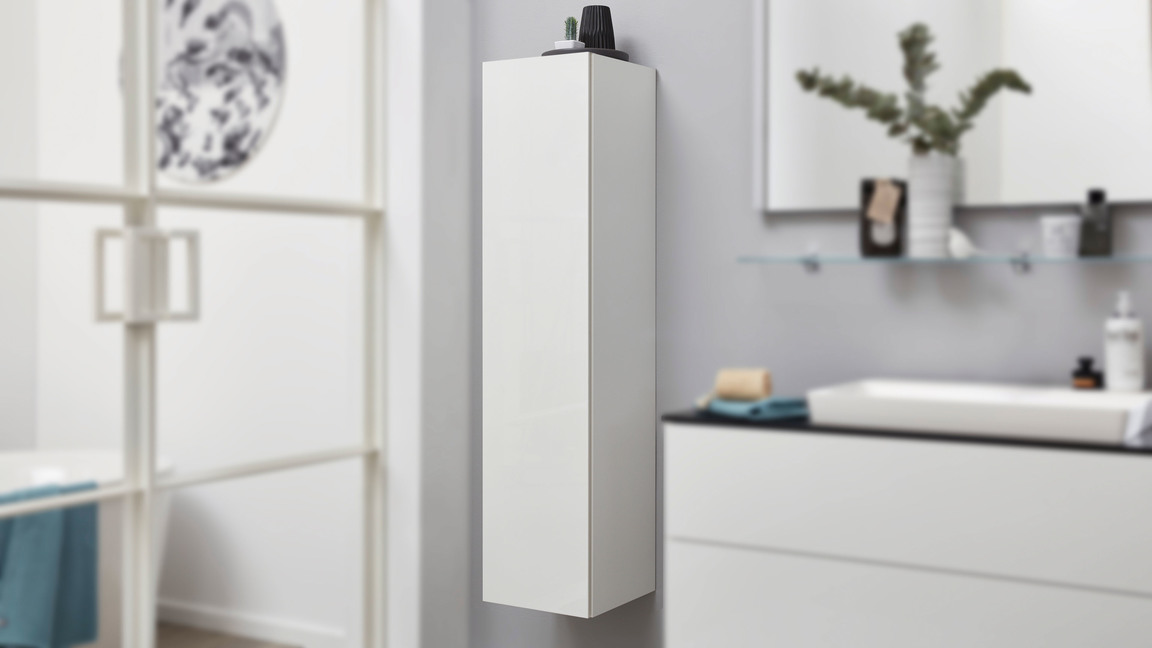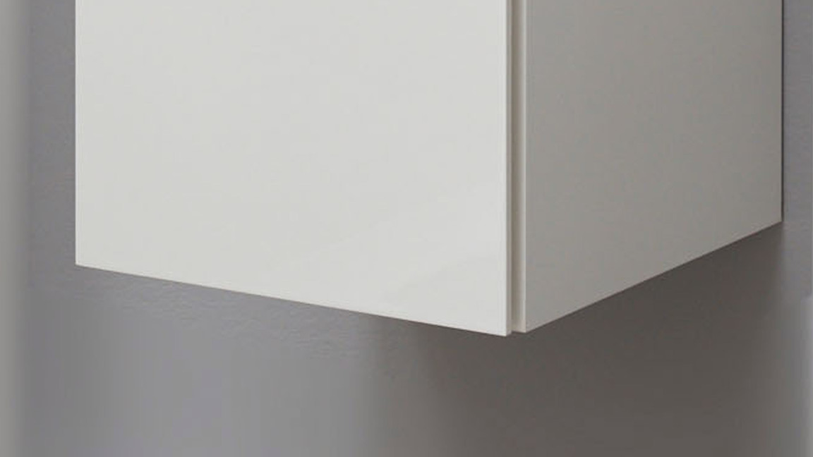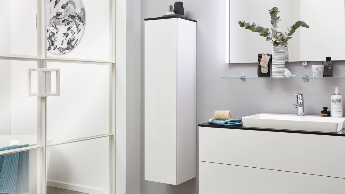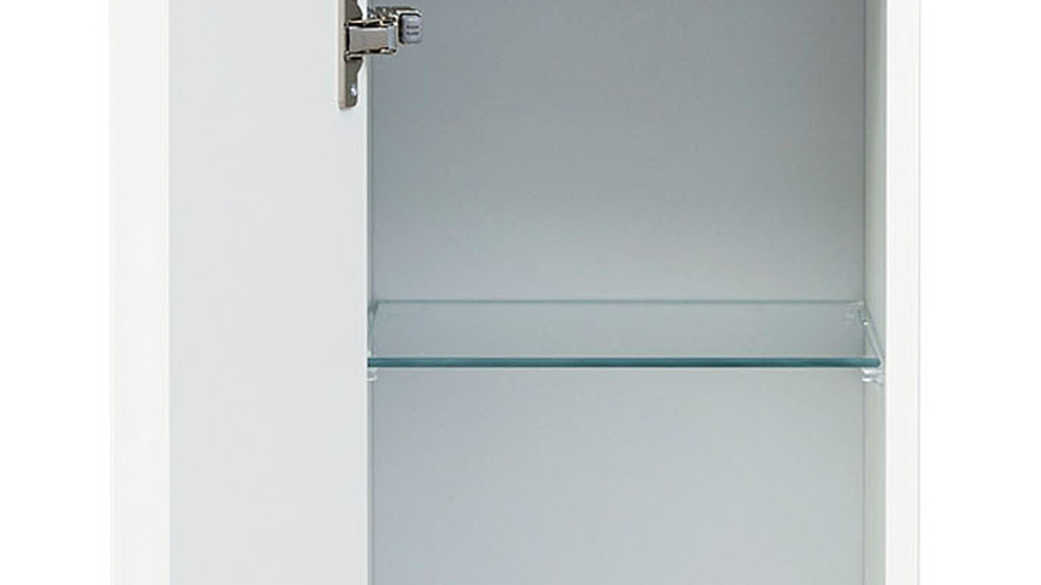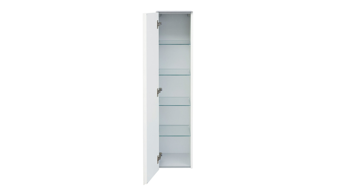 Sowohl der Korpus als auch die Fronten des stilvollen Badmöbels sind weiß hochglanzlackiert. Zur edlen Optik trägt weiterhin die grifflose Frontgestaltung bei - zum Öffnen der links angeschlagenen Tür ist Premium-Push-to-open-Silent integriert. Apropos Tür: Dahinter befinden sich vier Glasböden, die Ihnen Stauraum für Ihre Kosmetika und anderen Badutensilien bereitstellen.
