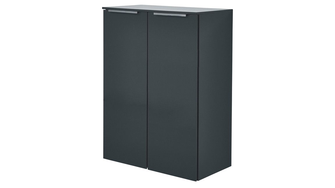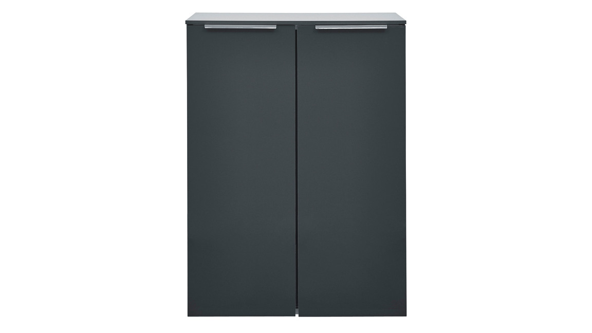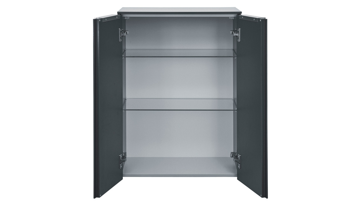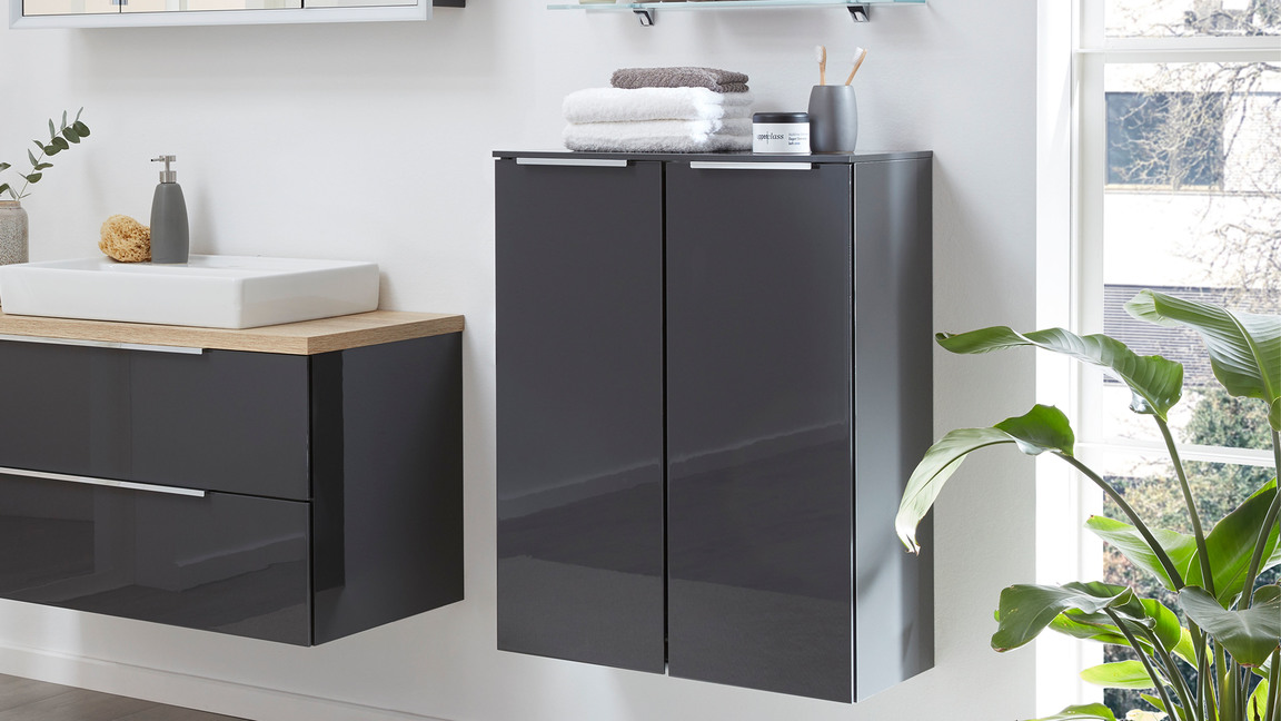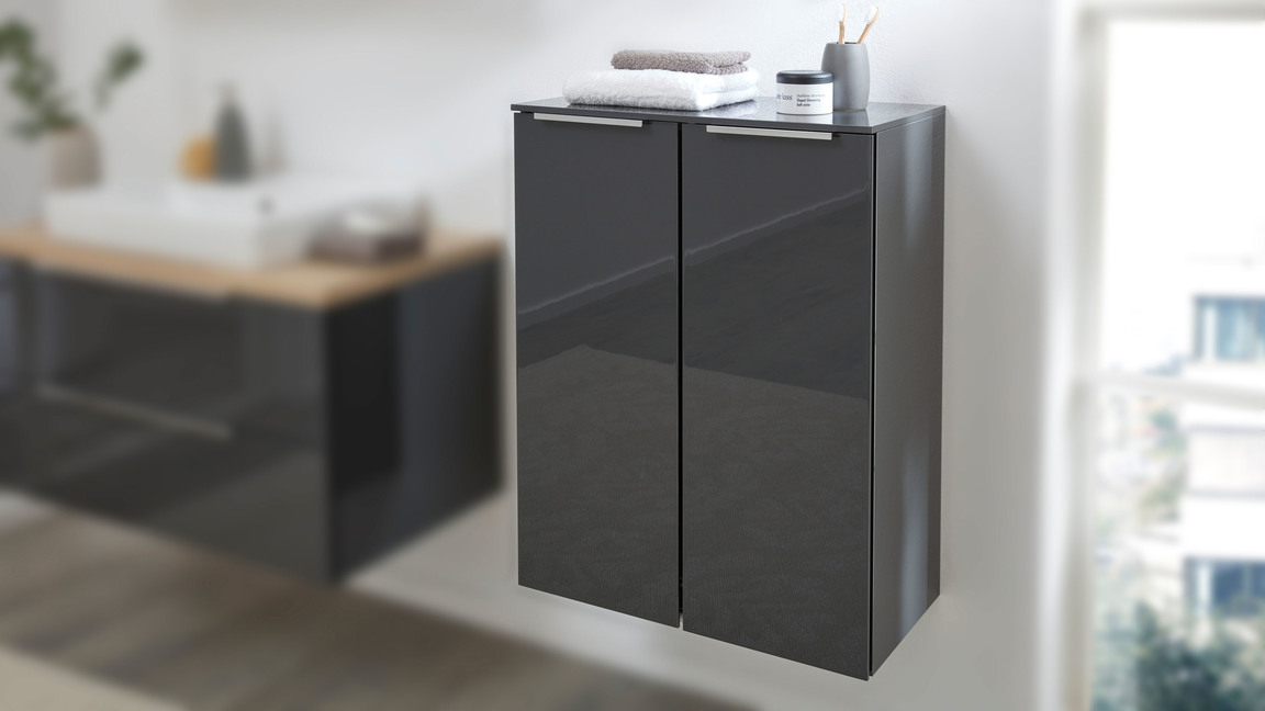 Sowohl der Korpus als auch die Fronten des stilvollen Badmöbels sind karbonfarben hochglanzlackiert. Zur edlen Optik tragen weiterhin die verchromten Griffleisten an den zwei Türen bei. Apropos Türen: Dahinter befinden sich zwei Glasböden, die Ihnen Stauraum für Ihre Kosmetika und anderen Badutensilien bereitstellen.