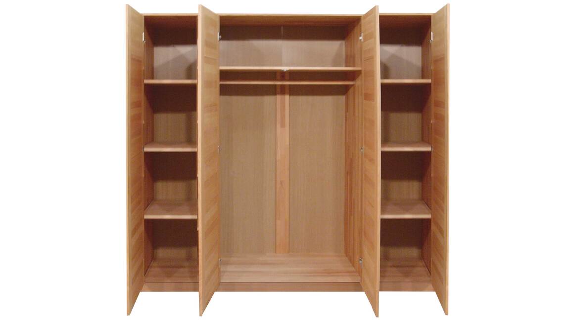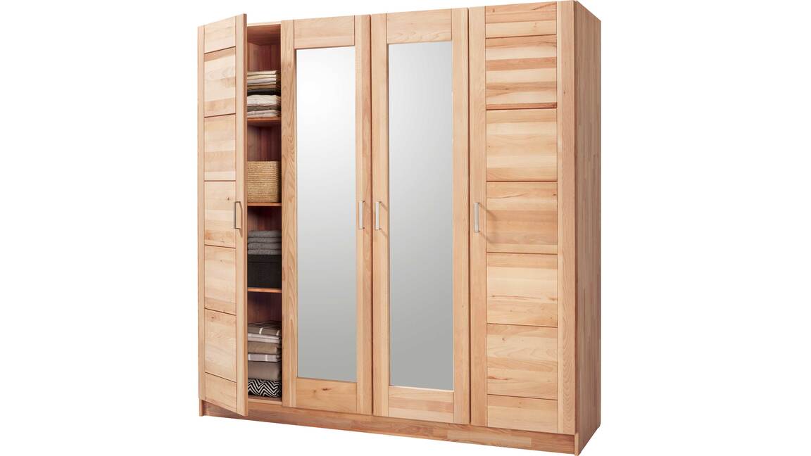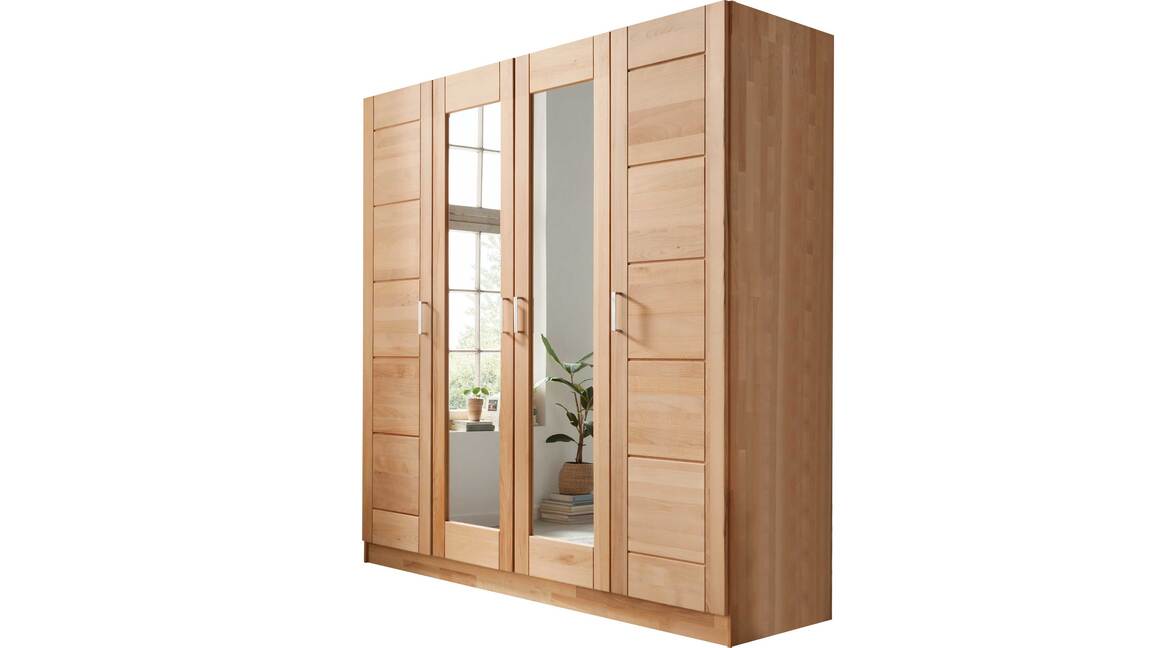Er bietet sehr viel Platz für Ihre Kleidung und äußerst praktisch ist auch der integrierte Spiegel. Der viertürige Kleiderschrank besteht aus geölter massiver Kernbuche. Er hat links und rechts zwei Holztüren und in der Mitte zwei Spiegeltüren. Die Türen sind wahlweise mit links oder rechts anschlagbar.