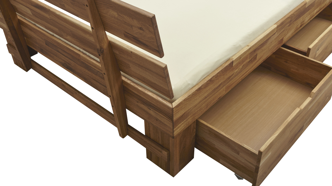 Aus keilverzinkter geölter Wildeiche gefertigt, besticht das Doppelbettgestell mit einer großzügigen Liegefläche von ca. 180 x 200 cm (BxL) sowie einem praktischen Regalboden im Fußteil. Weiteren Stauraum bieten die vier Bettkästen auf Rollen, die ca. 78 x 18 x 64 cm (BxHxT) groß sind und jede Menge Stauraum für Bettbezüge, Kissen und Decken schaffen.