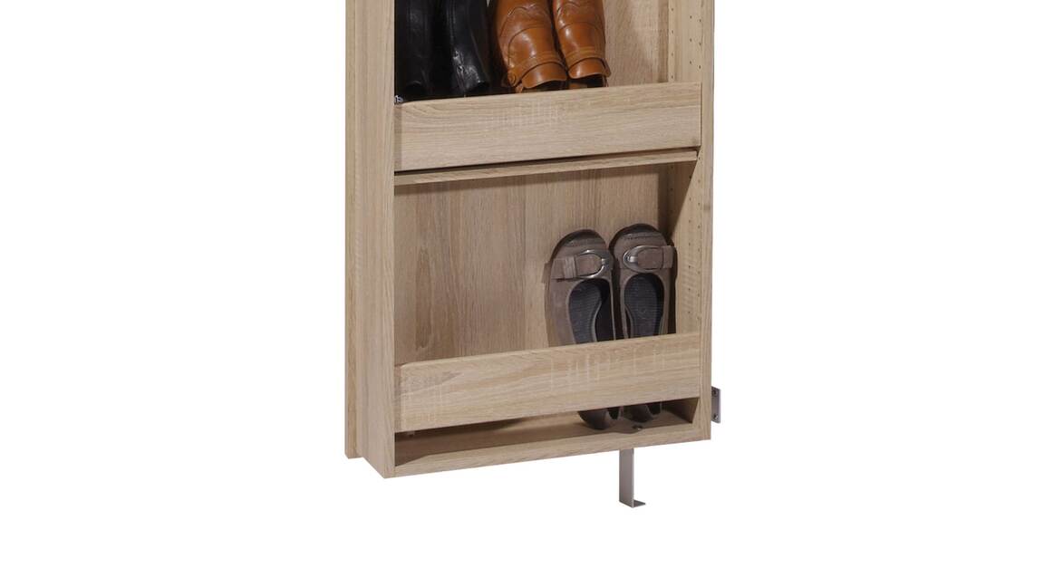 Dieser formschöne Schuhschrank kombiniert zwei wunderbare Funktionen und wird so zum unverzichtbaren Garderobenmöbel für Ihren Eingangsbereich. Dabei begeistert der Schuhschrank mit ausreichend Platz für Ihre Sneaker, Halbschuhe und Sandalen, die Sie in dem Dielenmöbel ordentlich und sicher verstauen. Durch die Sonoma eichefarbenen Kunststoffoberflächen ist das Modell pflegeleicht und optisch ansprechend. Kombinieren Sie die Schuhaufbewahrung zu hellen Holzmöbeln oder einer weißen Garderobe, um ein modernes Ambiente zu schaffen.