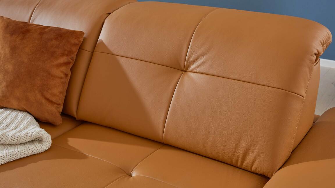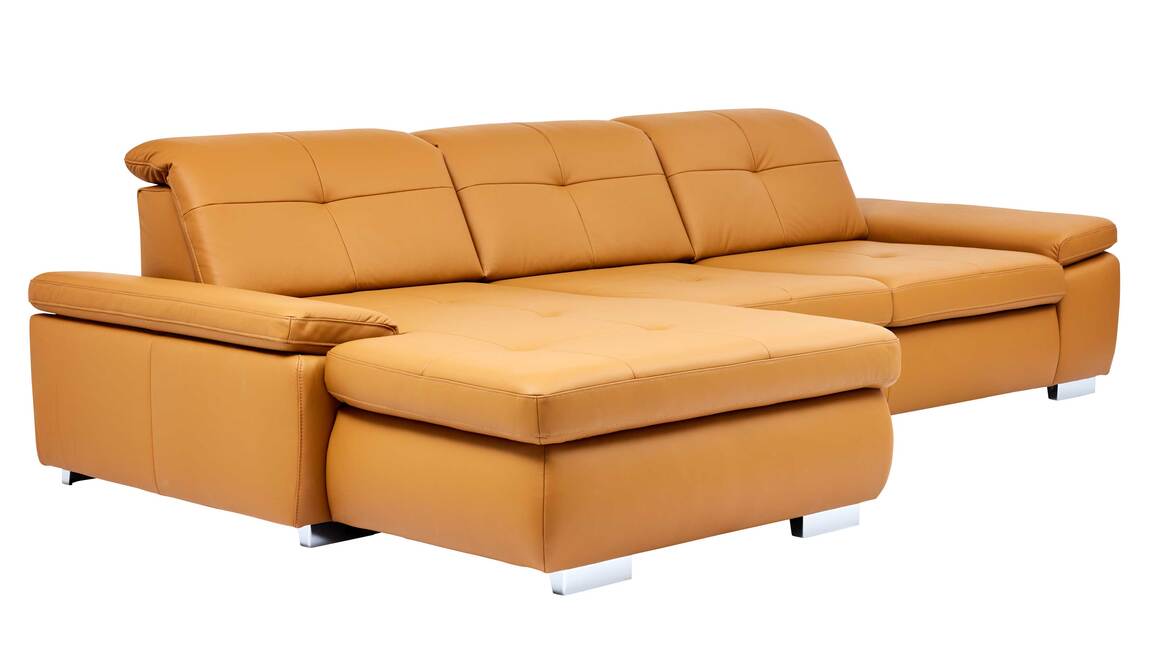 Auf der kurkumafarbenen Modulmaster Eckkombination MM-PN1044 nehmen Sie mit Ihrer Familie oder Freunden Platz und genießen hohen Sitzkomfort auf einer Kaltschaumpolsterung. Lassen Sie sich von dem Ecksofa begeistern, das mit Lederbezug, silberfarbenen Metall-Rollenfüßen und einem mit Spannstoff bezogenen Rücken ein optischer Hingucker in Ihrem Wohnzimmer ist. Der Semi-Anilin Lederbezug hat eine feine Lederstruktur, ist angenehm soft im Griff, pflegefreundlich und leicht zu reinigen.