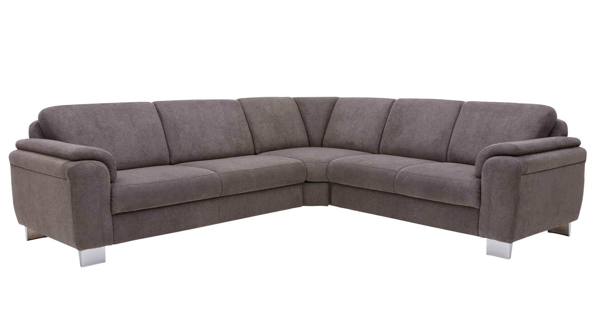Dank der soften Kaltschaumpolsterung auf einer stützenden Wellenunterfederung im Sitz und den ebenfalls mit Kaltschaum gepolsterten Rückenlehnen gewährleistet die Couchlandschaft hohen Komfort. Sie besteht aus dem 2,5-Sitzer 2,5L mit Armlehne links, dem Trapez-Eckelement PER und dem Zweisitzer 2R mit Armlehne rechts.