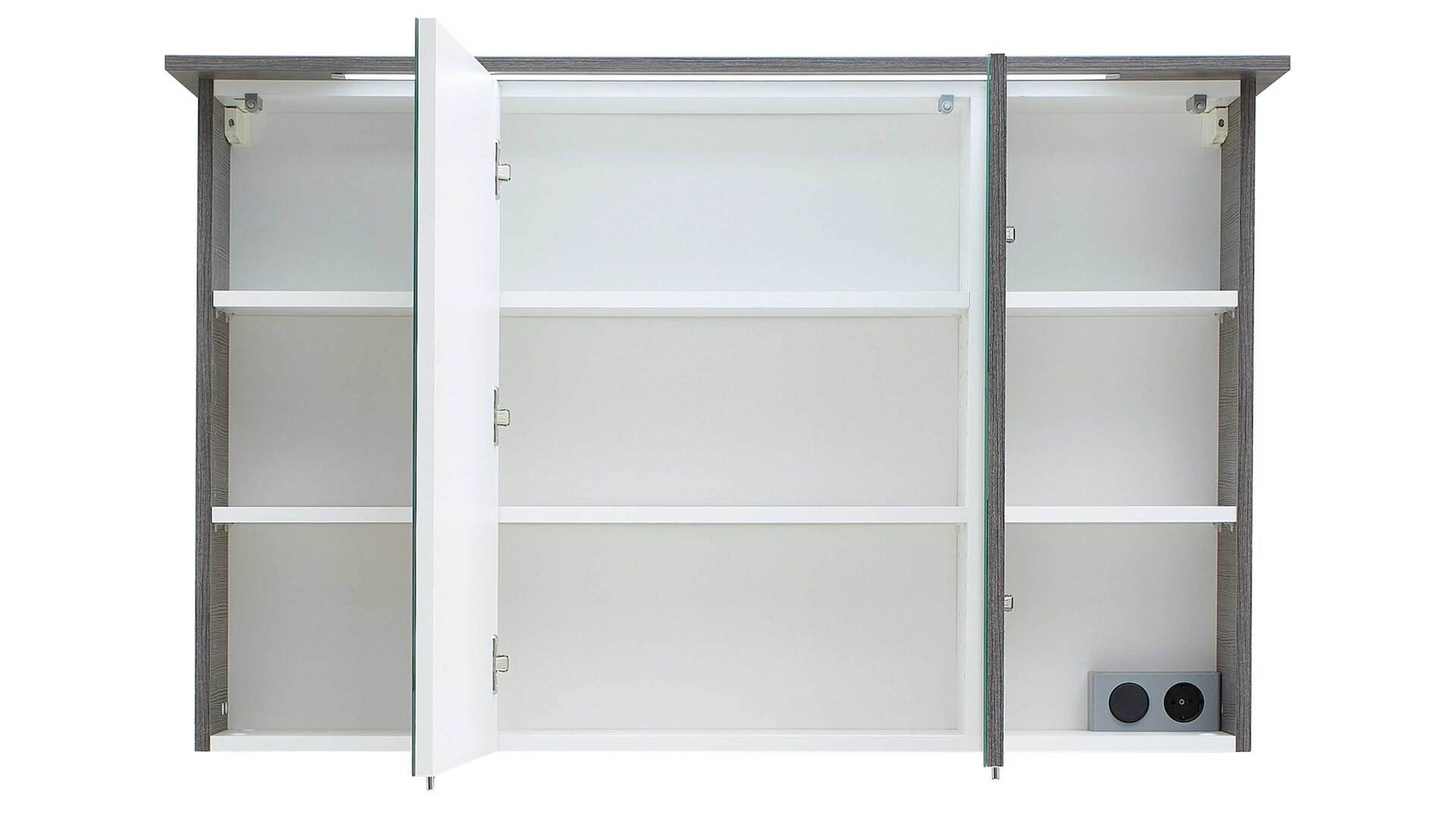 Mit seinen drei Drehtüren und jeweils zwei höhenverstellbaren Glasböden bietet der Schrank ausreichend Stauraum für all Ihre Badezimmerutensilien. Besonders praktisch: Der Spiegeltürenschrank ist mit einem Schalter und einer Steckdose ausgestattet, sodass Sie Ihre elektrischen Geräte direkt im Schrank anschließen können. Die fest verbaute LED-Beleuchtung sorgt für eine angenehme Atmosphäre und eine optimale Ausleuchtung im Bad. Mit einer Helligkeit von 620 Lumen und einer Lichtfarbe von 6500 Kelvin schaffen Sie eine angenehme Stimmung und eine gute Sicht.
