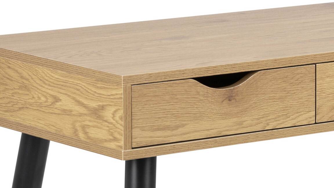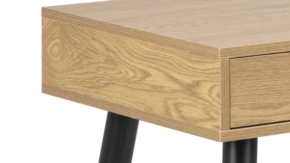 Diesem Schreibtisch gelingt es, modernen Stil mit etwas antikem Charme zu einem außerordentlich attraktiven Möbel zu verbinden. Seine Füße bestehen aus klassisch-mattschwarz pulverbeschichtetem Metall mit einer rauen Oberfläche. Sie sorgen für einen stabilen Stand des Tisches. Das Highlight bildet die Tischplatte in natürlich anmutender Wildeiche-Nachbildung. Durch die robusten Melaminoberflächen ist sie sehr kratz- und stoßfest sowie wasserabweisend und pflegeleicht.