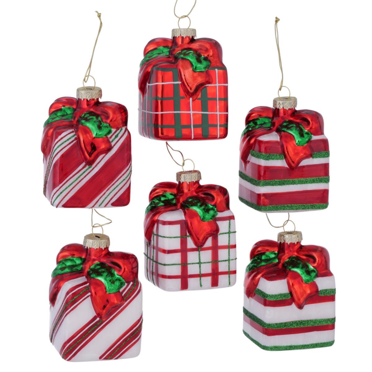 Die feinen Muster mit Streifen und Karos verleihen den kleinen Geschenken einen charmanten Retro-Touch, während die glänzende Oberfläche das Licht der Lichterkette stimmungsvoll reflektiert. Durch die praktische Aufhängung lassen sich die Ornamente einfach befestigen und vielseitig kombinieren.